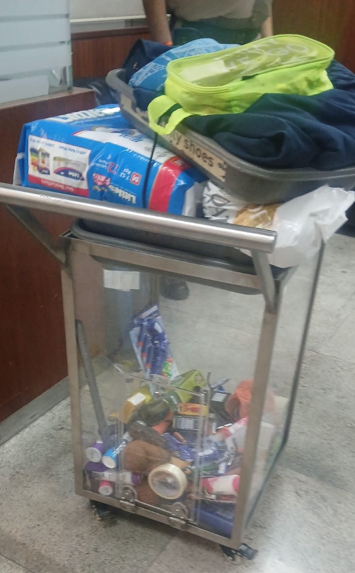 We assured him that there should be no issue if the prasad was placed in the check-in baggage because, as far as we know, passengers carry more dangerous liquids. I suggested that if any objections arose, he could hand it over to the airline or security for safe delivery to his address. We reassured him that there was no issue and advised asking the airline to send it by courier on a “to-pay” basis. The airline staff agreed to hold the prasad and offered to hand it over to any person who could come and take it out. As expected, the Indigo Airlines staff objected to the wet coconut prasad being in the check-in baggage.