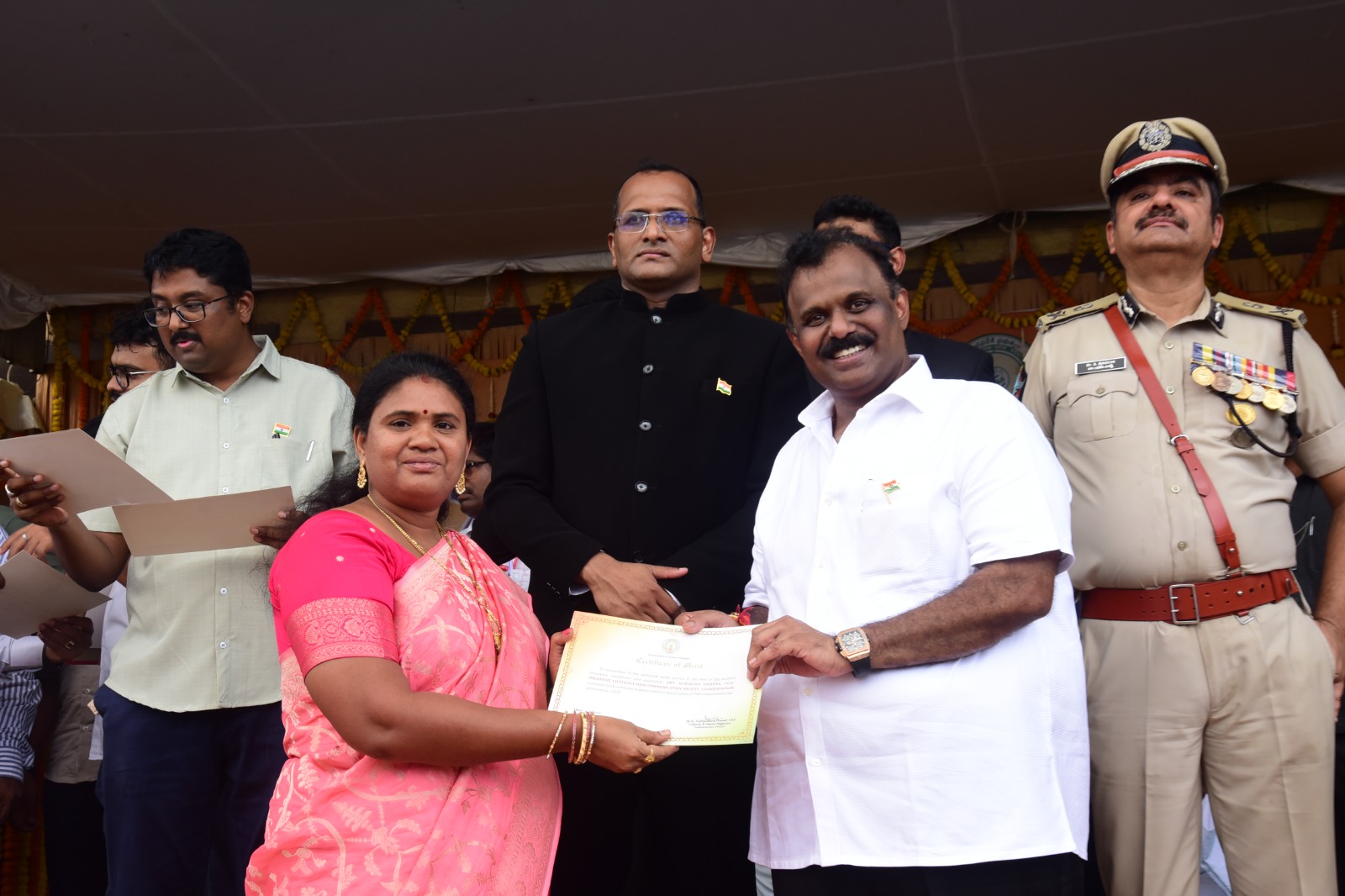 The award ceremony was held at the Police Parade Grounds, where Shri Anagani Satya Prasad, Hon’ble Minister of Revenue, Registration and Stamps, Government of Andhra Pradesh, presided as Chief Guest. Following the ceremonial unfurling of the National Flag, he joined District Collector Shri M. N. Harendra Prasad in presenting the certificate of appreciation to Smt. Korikana Sujatha, representing Vistarana Info Society.